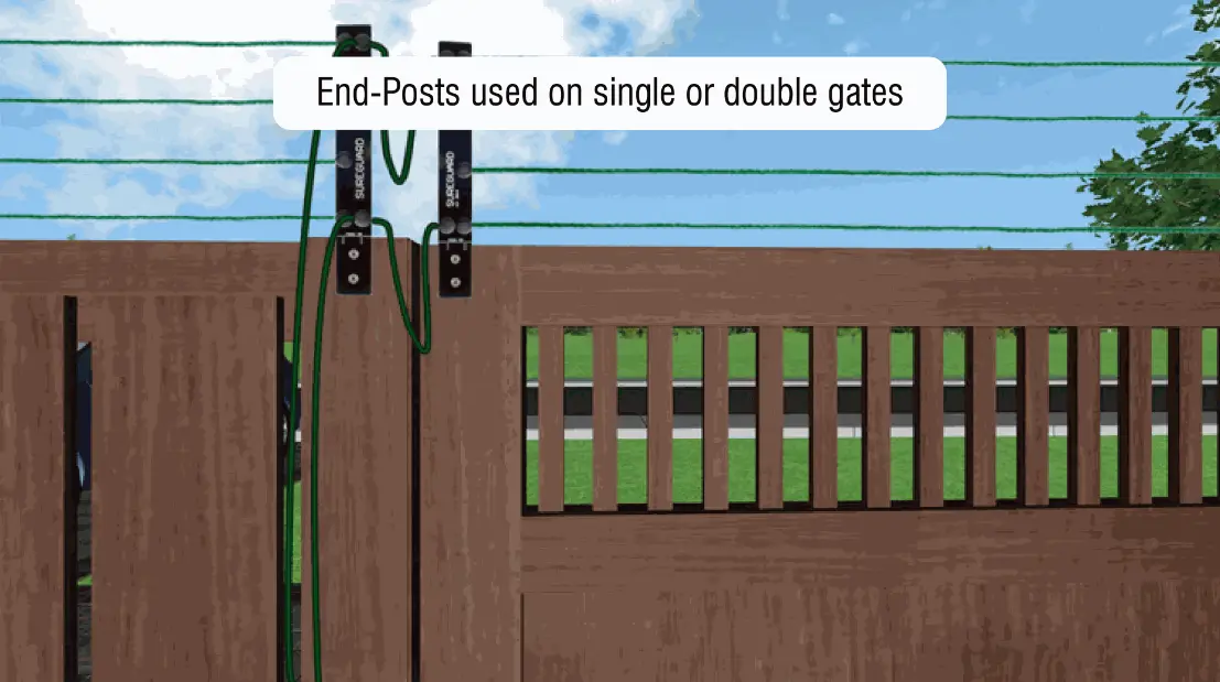 Important: End Posts must be fastened to a rigid surface such as timber or metal. You decide whether to fasten these to your fence posts, top rail or the fence. Notice the printed marking “Fence Top”. This is a suggested alignment point to the top of your fence. When aligned to the marker the lower wire will be 1.5cm from the fence top. You can alter this within certain limits.
